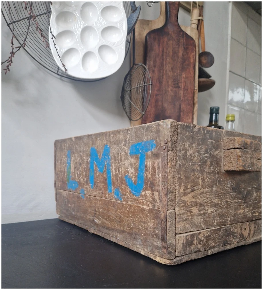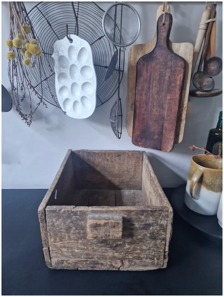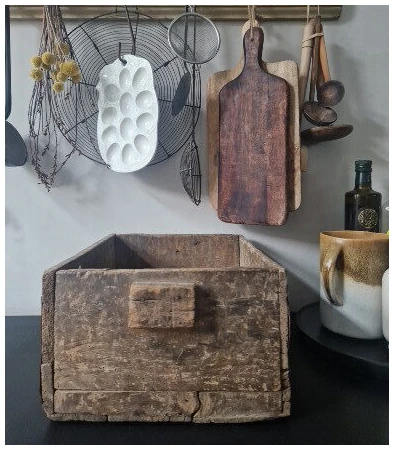 Breng een vleugje nostalgie en karakter in uw interieur met deze prachtige oude houten bak. Dit veelzijdige decoratiestuk is niet alleen een stijlvol accessoire, maar ook functioneel. Plaats het op uw aanrecht om flessen netjes en stijlvol op te bergen, of gebruik het in de kinderkamer voor het organiseren van boekjes en speelgoed.