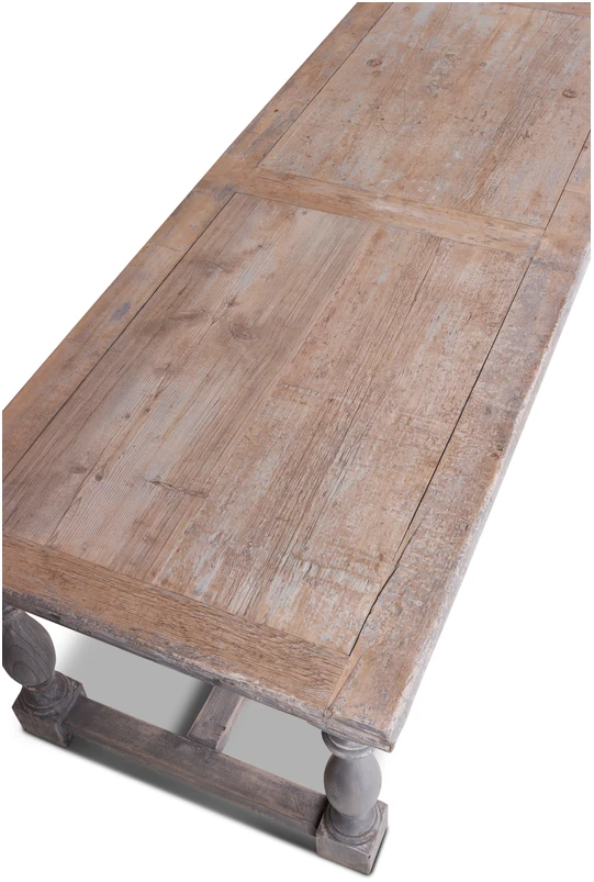Het tafelblad is gemaakt van massief hout en heeft een verweerde afwerking, wat zorgt voor een unieke vintage uitstraling. De decoratieve, gedraaide poten geven de tafel een elegante kasteelachtige charme en zorgen tegelijkertijd voor een stevige constructie. De tafel is voorzien van een stevige dwarsbalk onderaan, wat niet alleen de stabiliteit verhoogt, maar ook bijdraagt aan het authentieke karakter.