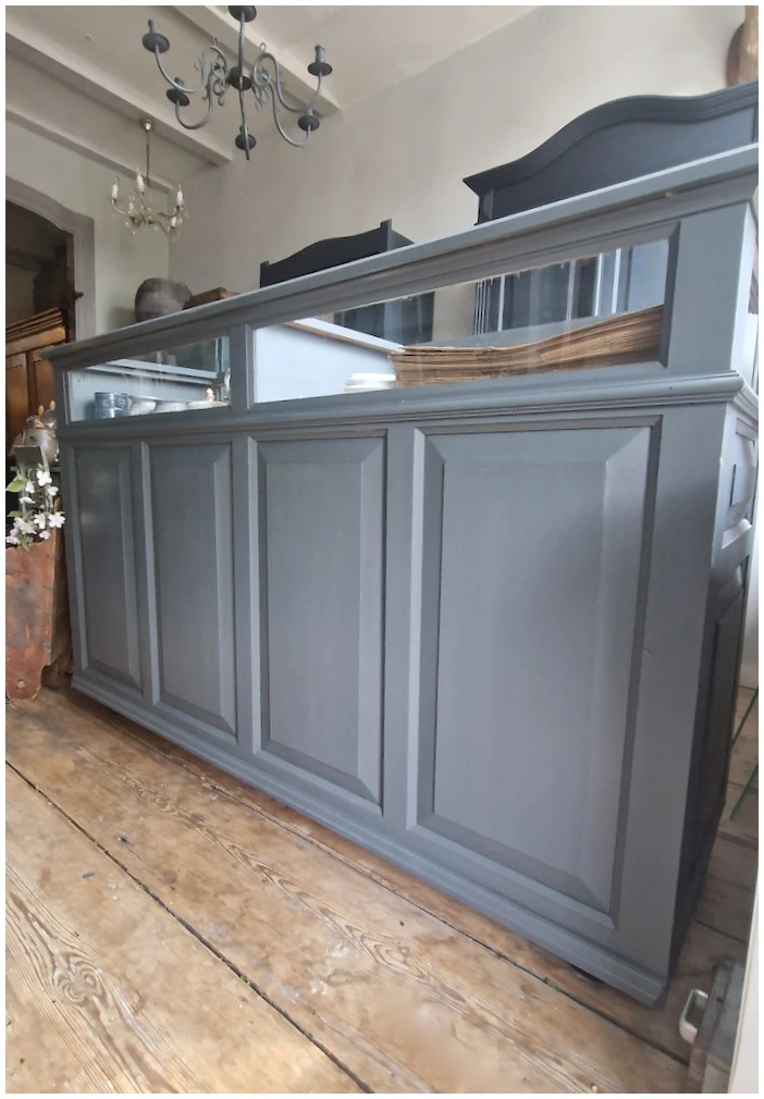 Prachtige oude toonbank van oud grenen. In een mooie warme grijs van Farrow & Ball. Met glas ook aan de bovenkant. Dat kan eventueel vervangen worden voor hout, en in dezelfde kleur geschilderd worden.