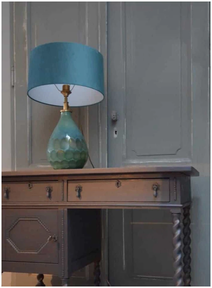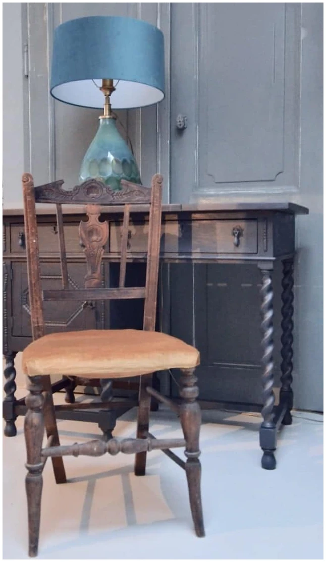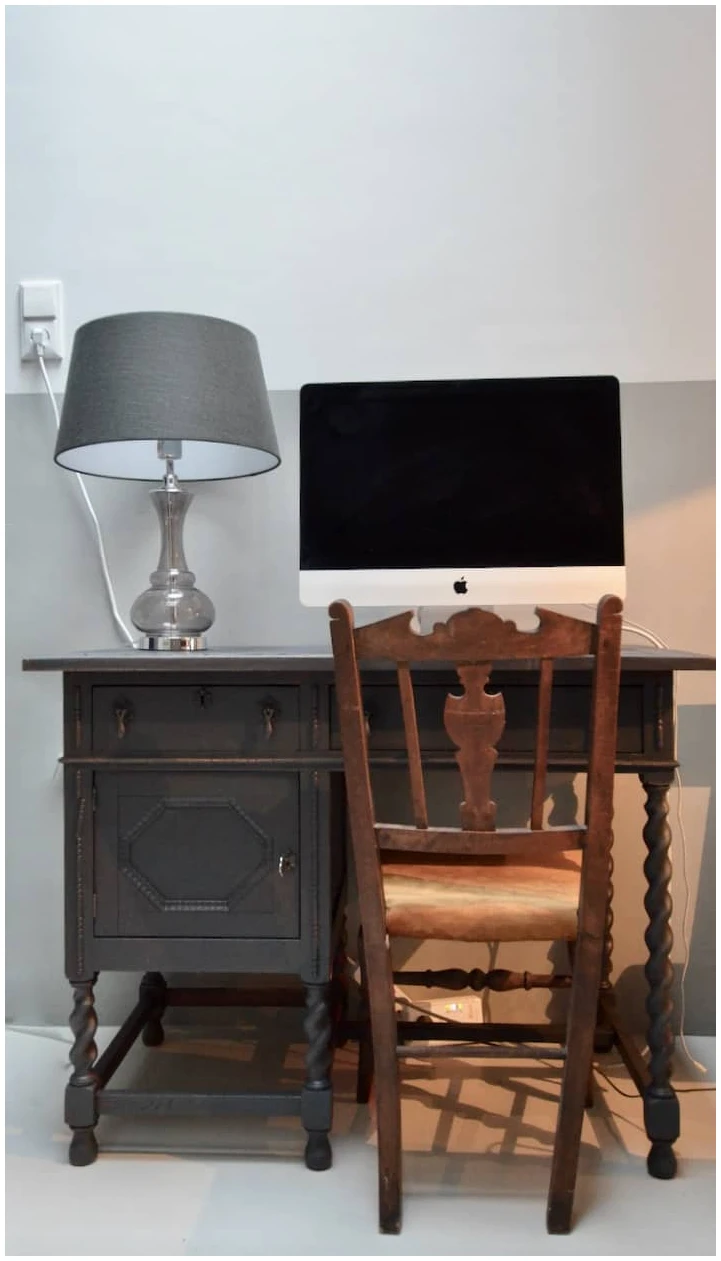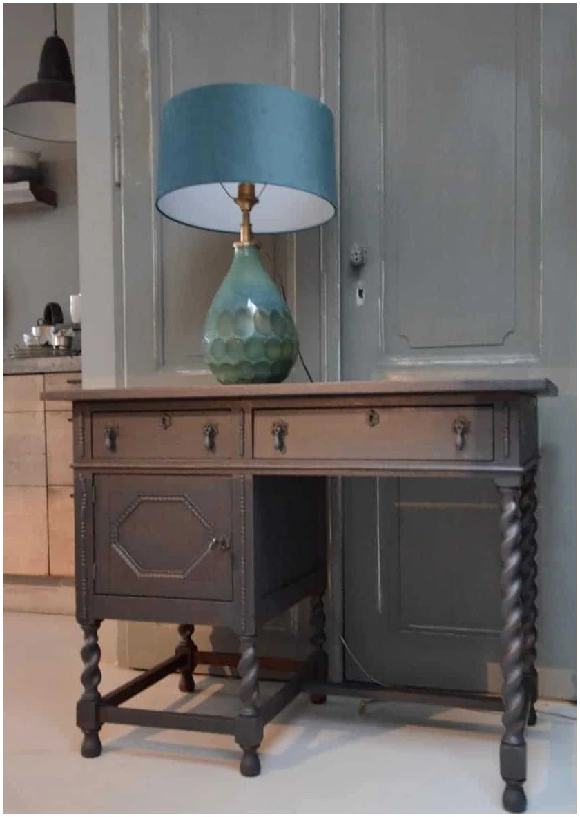 Schattig vintage eikenhouten dames bureau met mooie draaipoten. Links een kastje en bovenin twee laden. Het bureautje is helemaal schoongemaakt en ontdaan van alles was. en waar nodig was gerestaureerd. De kleur is een hele mooie warme off black. Maten zijn 99 breed, 60 diep en 60 hoog vanaf lade, 46 breed in het zitgedeelte een 77 hoog. Stoeltje is ook te koop en kan in dezelfde kleur geschilderd worden.